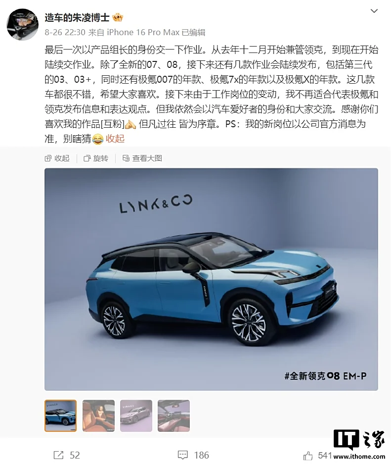 此前,朱凌任极氪科技集团副总裁、领克品牌产品组长。