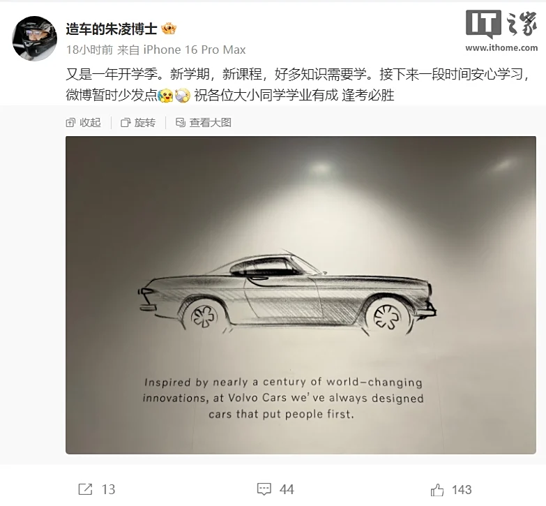 朱凌昨日晚间还晒出一张沃尔沃汽车相关的草图,并表示:“又是一年开学季。新学期,新课程,好多知识需要学。接下来一段时间安心学习,微博暂时少发点。”